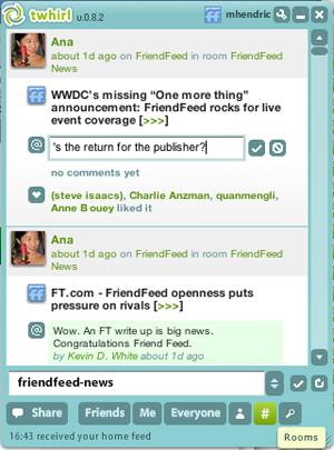 Twhirl version 0.8.2, released just moments ago, improves the AIR client’s FriendFeed support by adding the ability to comment and “like” items inline, filter by rooms, view avatars, and access links in comments. Pics can also be dragged and dropped onto the client for quick sharing.