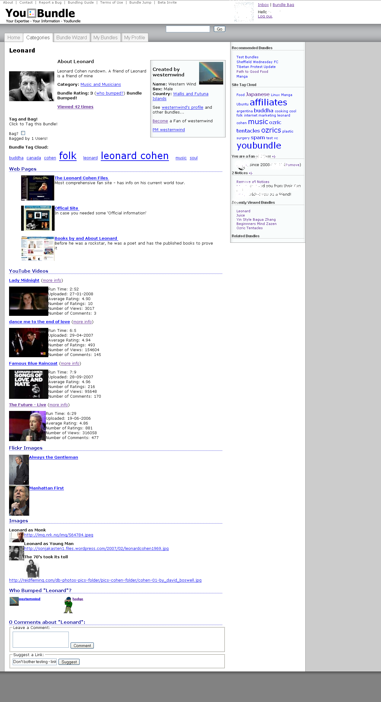 Like Mahalo, YouBundle is more of a Web guide than an actual search engine. Bundles of Web links, YouTube videos, Flickr images, Amazon product descriptions, and uploaded photos and documents are created around different topics. These can be anything from “VC Funding Resources” to “Tibetan Buddhism” to “Apple Rumors Sites.” Bundlers add titles, tags, and descriptions to each bundle. The company explains to beta testers in its guidelines: