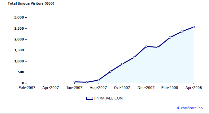 I was not able to test the site out myself, so I can’t say if it is producing better results than Mahalo, Topicle or Wikia Search. But the steep rise in Mahalo’s traffic, much of it driven by the SEO juice its pages have, is no doubt a motivating factor here. According to comScore, Mahalo attracted 2.6 million unique visitors worldwide in April, up from zero when it launched last summer. Total pageviews were 5.6 million.