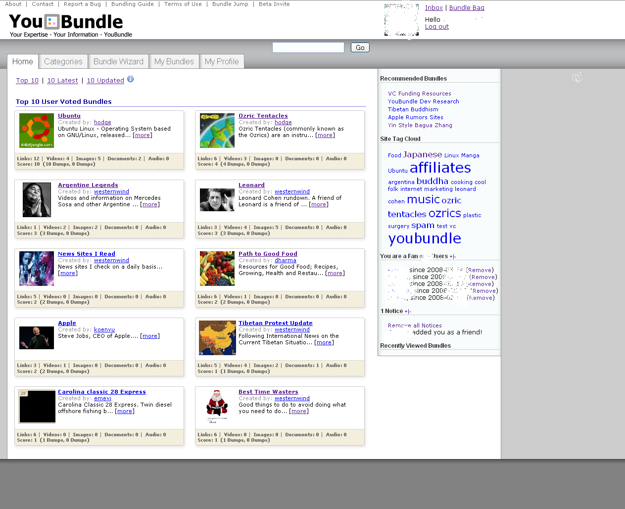The YouBundle community is also be able to vote the best topic pages up by “bumping” them, or vote them down by “dumping” them. Dumps are “anonymous in order to prevent retribution dumps,” says the guideines. Members can also “bag and tag” other people’s bundles. Bagging a bundle is like bookmarking it as one of your favorites, and once you do that you can up to three tags to improve the categorization of the site.