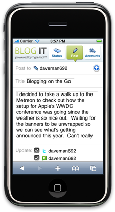 The company originally released BlogIt as a Facebook app in April. Both versions currently support posting to Movable Type, TypePad, Vox, LiveJournal, Blogger and WordPress, along with the social networks mentioned above.