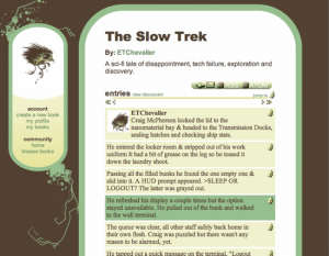 In order to compose a so-called book, users first choose a title and then submit posts with a maximum of 140 characters. Entries belonging together are displayed one below the other in a thread-like structure. Authors are able to create any kind of text-based content over time, including diaries, short stories, poems or even novels. Here is an excerpt from one called Saijo City Notebook by Eric Rice: