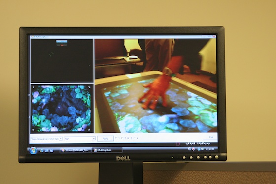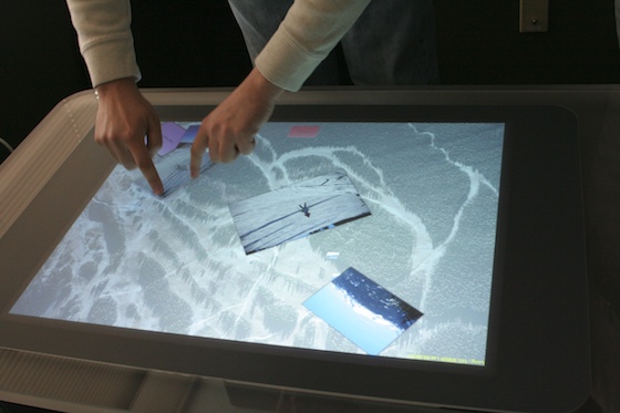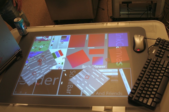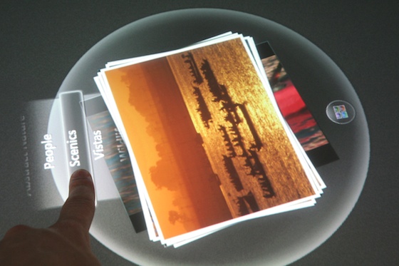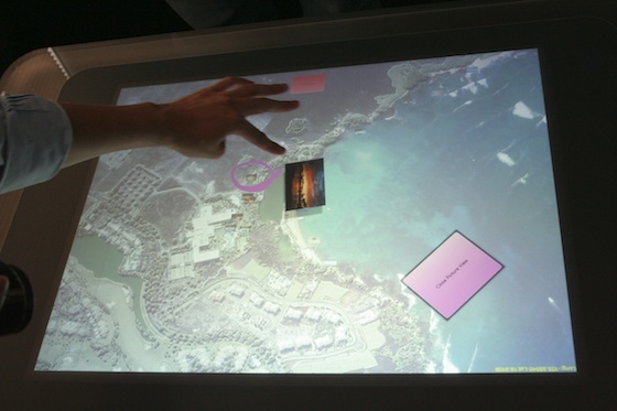First, we saw a really nice photo app that’s going to be shipping with the units. It’s actually not that hard to set up, apparently — we had a developer show us how to throw together a pretty complex photo-and-tag-viewing program for the Surface in just a few minutes. The SDK is pumped up with all kinds of shortcuts and things that allow developers to take advantage of, say, the ability to slide an object around and have it stop based on friction or what objects it hits. This is great for the photo app, where you can move photos in and out of a little bubble or bar and toss them back in easily. Sorting and stacking the pictures felt very natural, like just sorting your usual 3x5s, except in this case some were videos, some you could expand to enormous size, and you could organize them automatically by metadata, category, and so on.