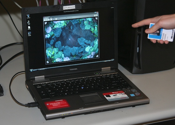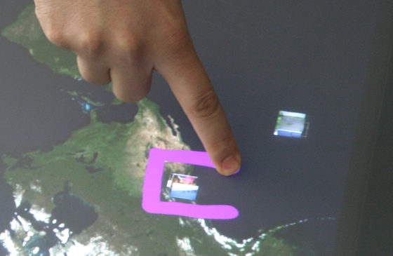 Next we saw probably one of the coolest things I’ve seen in a while. Essentially a geotagged photos viewing application, it had Virtual Earth (very fun to play with, as I did without permission for a bit) and spread across the world were little photos. The photos were placed on the map exactly where they were taken and they could be selected by hand gestures, or filtered by other means so that only, say, panoramic photos taken in 2007 would show up. I know I have a lot of those. Geotagging has always been kind of “meh” for me, but this made it accessible, purposeful, and entertaining. And it was something a developer had been working on in his spare time.