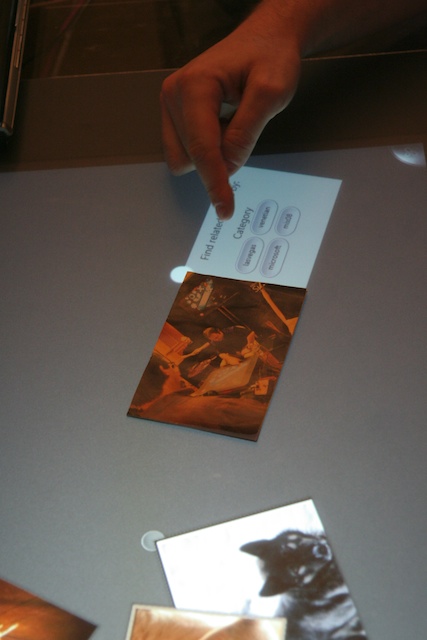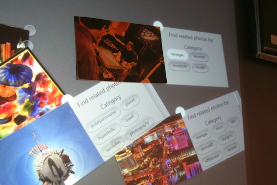 The developer we talked to built this app that, using pretty simple coding and in just a couple minutes, would read the tag on the back of this physical picture, fetch the metadata from the flickr account it was from originally, and display it all side by side with the other tagged, categorized pictures that were in fact not physically real. Seriously people, this was like some science fiction tech here but it’s real and it actually works very well.