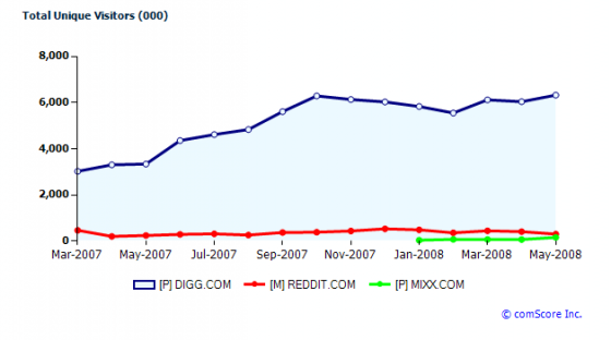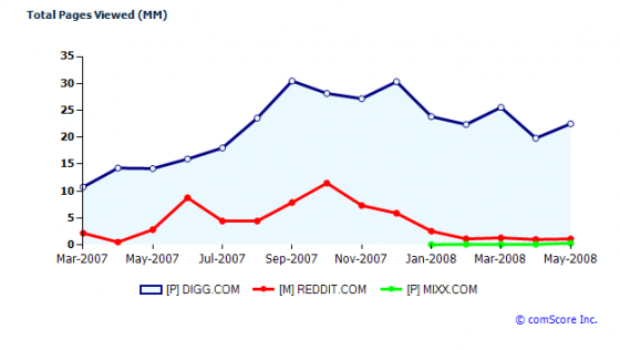 And the winner here clearly is Digg (as long as it doesn’t alienate it’s core users), despite valiant efforts by Reddit, Mixx, and others. In May, Digg had more than 20 times as many U.S. visitors and pageviews as Reddit, according to comScore. Even if comScore is undercounting, and the relative gap is only half that much (which is what data from Compete suggests), it is still pretty insurmountable.
