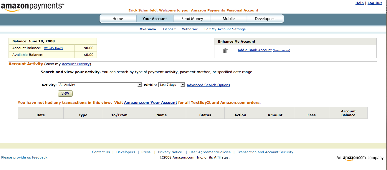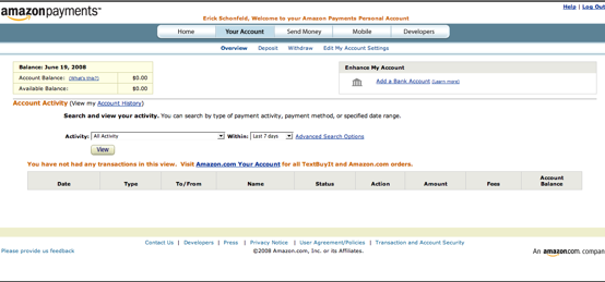 The article notes that both of these services exist, but does not explain how Amazon could go beyond their current offerings. So it is not exactly clear what further steps Amazon will take to beef up its current Amazon Payments service into a full-fledged competitor to PayPal. In terms of functionality, it is already pretty close. It even looks the same as PayPal. (Click on screen shot above).