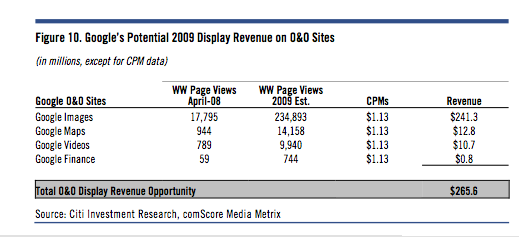 But the single biggest opportunity for Google to become a major player in display advertising is not DoubleClick. It’s YouTube. At least in the short term. Mahaney estimates that Google can sell $500 million worth of display ads (including video ads) on YouTube in 2009. In contrast, he estimates that DoubleClick will contribute only $280 million in revenues in 2009. Google Images, Google Maps, Google Videos, and Google Finance could bring in another $265 million, if fully plastered with ads.