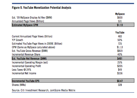 Here’s how he comes up with those numbers. First he applies a $1.13 CPM estimate for MySpace to YouTube, factors in a 50% growth in pageviews, and backs out a 40% revenue-share to come up with $491 million in display-ad revenues. These numbers maybe aggressive, though, because so far Google has sacrificed ramping up revenues on YouTube for market share gains. In fact, Mahaney’s analysis of the top 100 videos on YouTube right now shows that only 28 have ads, and onlyone of those is an interactive overlay ad. (The rest are banners or AdSense).