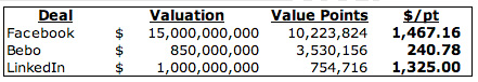 Since we have three recent data points valuing social networks (Facebook at $15 billion, Bebo at $850 million, LinkedIn at $1 billion), we can start to apply valuation ranges based on the model. Facebook’s 10.2 million value points and $15 billion valuation puts a $1,467 value on each value point. LinkedIn is valued very similarly, at $1,325 per value point. Bebo, with lots of users in the rich UK market, appears to have been undervalued at only $241 per value point.