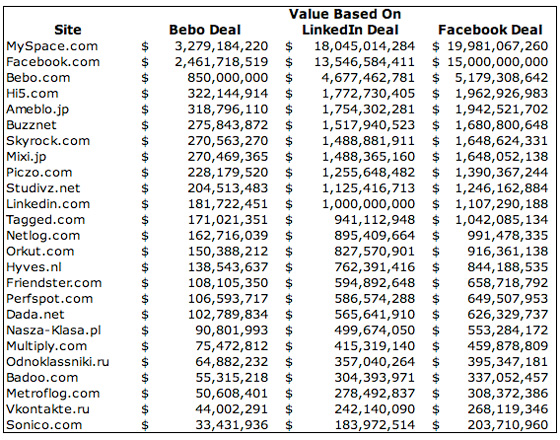 Based on these three publicly available data points we’ve created value ranges for each of the top 25 worldwide social networks. There is a very wide disparity (MySpace, for example, is worth between $3.3 billion and $20 billion, based on which comparable you look at). But it does yield very interesting data. For example, If Facebook and LinkedIn were valued similarly to Bebo, they would be worth just $2.5 billion and $182 million, respectively, far less than what their investors recently paid for a piece of them.