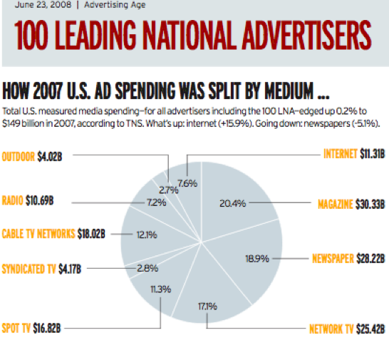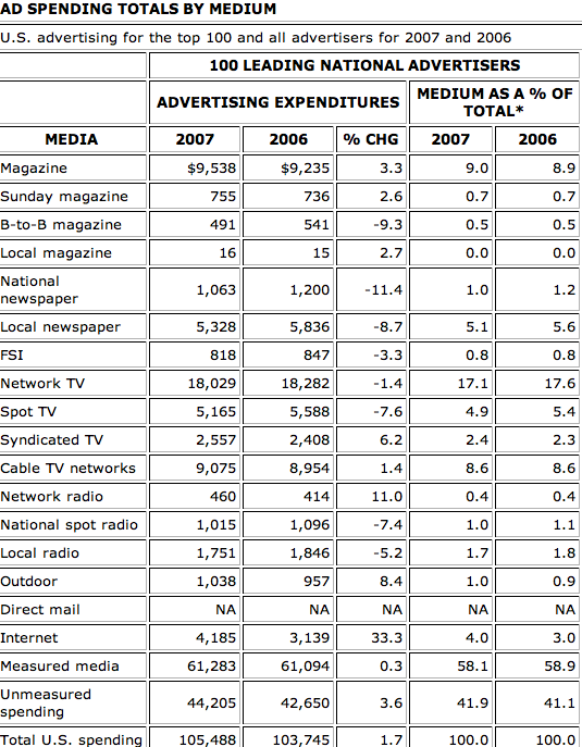 Here is a table from Ad Age showing the breakdown in spending for the top 100 advertisers (the $44 billion in “unmeasured spending” includes things like direct marketing, in-store advertising, and other promotions, and is not included in the figures cited above):