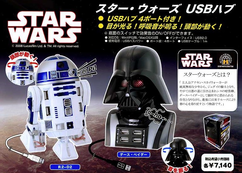 In late July, Japanese Star Wars geeks will be able to lay their hands on USB hubs shaped like R2-D2 and a Darth Vader bust. Both hubs stand about 15cm tall.