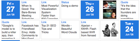 As entries get added to Swurl, the site will automatically detect what kind of content it is and “enhance” it accordingly. If you rent a film from Netflix, Swurl will append a link to the movie’s trailer on YouTube. Photos from Flickr will be shown full size in an automatically generated slideshow. You can use the impressive calendar function to visualize when actions have occurred, and there’s also a nifty “infinite scroll” that eliminates the need for a “previous” button – get to the bottom of the page, and the site will automatically load the next few entries without having to refresh.