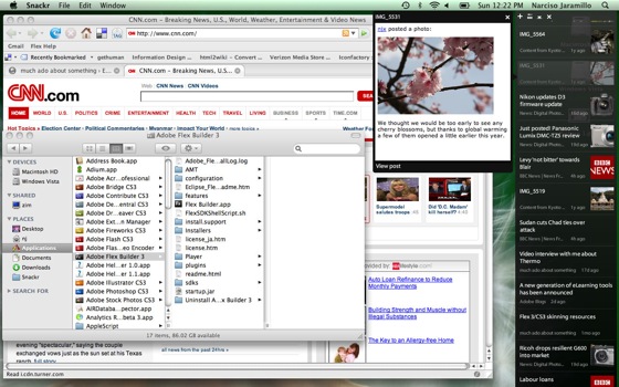 It’s slow this weekend so let’s offer a bit of service “journalism” by pointing you all to Snackr, an Adobe AIR-based RSS reader that pulls stories from your feed list or pre-made OPML file and displays them in random ticker along your desktop. It works in OS X and Windows.