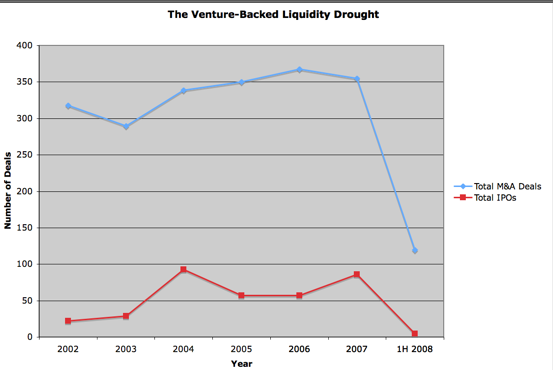 There were no venture-backed IPOs in the second quarter, and M&A deals are down. The last time there were no VC-backed IPOs in a quarter was in 1978. The liquidity drought for venture-backed startups is so bleak that the National Venture Capital Association is calling it a “crisis.” Last quarter there were only 5 IPOs that brought in a piddling $283 million. That compares to 43 IPOs during the first half of 2007 that brought in $6.3 billion.