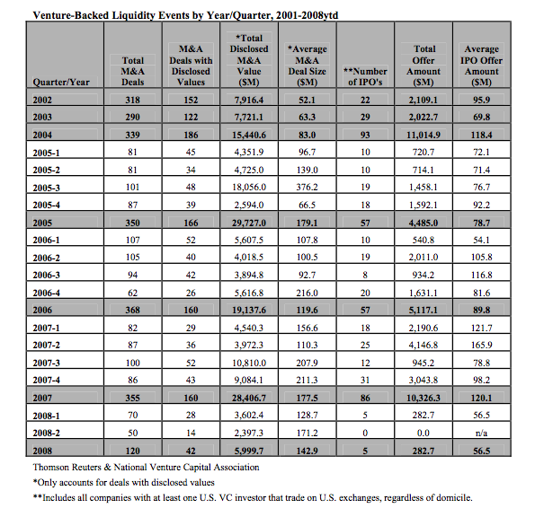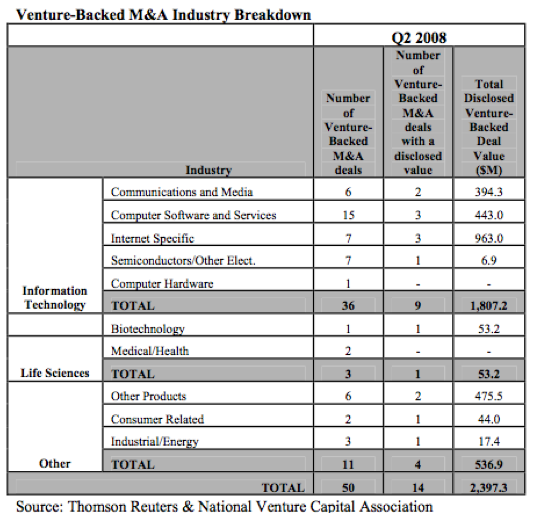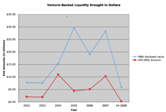 The other exit avenue for startups, getting acquired, is also getting narrower. During the first half of 2008, there were 120 VC-backed M&A deals, compared to 169 during the first half of 2007. Those deals whose amounts were disclosed brought in $6 billion, compared to $8.5 billion in 2007. That is 42 percent less cash for venture investors.