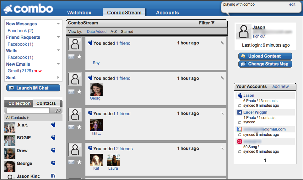 Combo’s current shortcomings are frustrating, because the site seems to have a lot of potential. Combo monitors and pulls recent activity from a plethora of services that include Facebook, MySpace, Flickr, Digg, and over thirty others. Your activities are all aggregated as part of a “ComboStream”, while the “Watchbox” lets you monitor the activities of your friends.