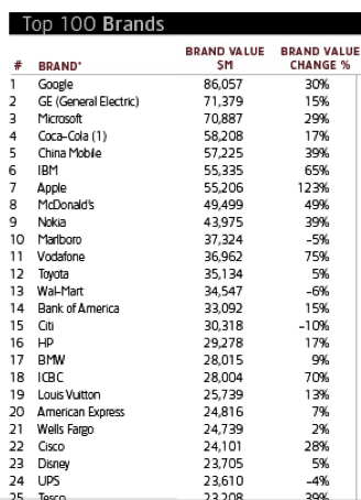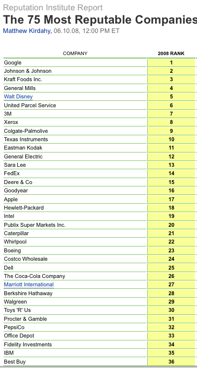It is instructive to compare some of these rankings to the top 100 brands, as measured by an estimate of brand value. (See below). Google, again is No.1. Microsoft is No. 3, IBM is No. 6, Apple is No. 7, Toyota is No. 12, HP is No. 16, American Express is No. 20, Intel is No. 27, and Dell is No. 41. About the only company the two rankings agree on is HP. These brand rankings feel like a better measure of reputation to me than the Reputation Institute’s survey.