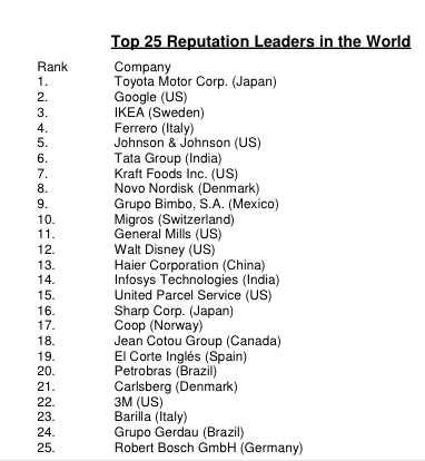 Who do you trust more, Google or Toyota? The answer might depend on where you live. In its annual corporate reputation survey of 60,000 people worldwide, the Reputation Institute finds that Google scores highest in the U.S., but is No. 2 worldwide after Toyota. On the global list, Ikea is No. 3, Johnson & Johnson is No. 5, and Walt Disney is No. 12. Apple doesn’t even make it into the top 25 (see below).