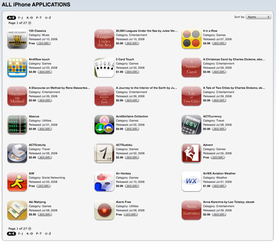 There are 27 pages of applications currently available. We’ve updating our directory with the more interesting applications now. At first glance, there are very few non-English applications. Another interesting trend – a lot of books are listed as applications, most for $0.99 (I just bought Heart of Darkness, for example).