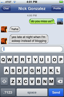 This application has the potential to eliminate the need for two other native iPhone features as well: SMS and Email. The app comes with Facebook Chat baked right in so you can send instant messages to friends who are currently online (either at their computers or on their phones). As soon as Facebook figures out a way to keep you “online” and available for chat even when the app is closed – and hooks Chat to the new push notification service so you’re aware of messages as they come in – I’ll be one step closer to saving that extra $10 per month I pay AT&T to let me send ludicrously overpriced text messages. Facebook should be working on a Chat-to-SMS (or Message-to-SMS) conversion feature that can be used to message with my friends who don’t own iPhones, or any other email-equipped smartphone.