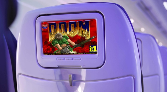 Of course, I’m not going to let something like a single-digit framerate stop me once I get started. I whupped shareware Doom like a pro, although I had to IDKFA it once or twice when the controller freaked out and dumped me in some inescapable situations. I forgot how awesome it is, even with a mustachioed man humming along with the Dixie Chicks next to me and the incessant thrum of the engines driving me insane. Try it out yourselves next time you’re flying VA.