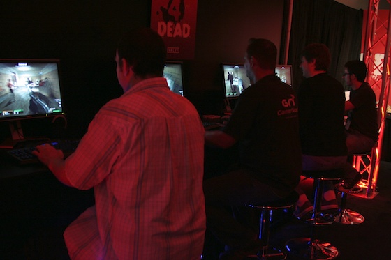 I then went over to Valve’s modest little spot for a bit of Left 4 Dead. I’m in a hurry so I’ll just tell you it’s awesome and it gets really intense when you’re doing well and it starts throwing lots of zombies at you. It can get pretty freaky too. The zombies are pretty weak individually, but once they start pouring out you get this “Oh god oh god” feeling in your stomach and you (if you’re me) start crying out to your teammates stuff like “Oh shit, guys, quick, go to the – oh no! Turn around! OH NOOO!” Fun times.