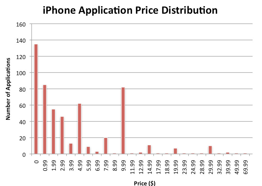 All the other price points are shifting to either 99 cents or $9.99, implying that the sweet spot is 99 cents for most apps just as it is for songs. But with the caveat that if your app is good enough people will be price insensitive. Below is the price distribution of iPhone apps the day of launch, for comparison purposes.
