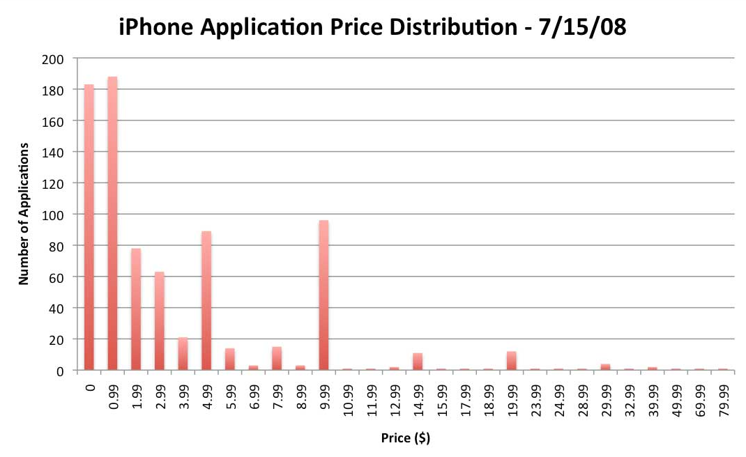 When the iPhone App Store launched last Friday along with the new 3G iPhone, free apps made up 24 percent of the 552 apps available. In other words, the most popular price point was free. The rest of the apps ranged in price from 99 cents to $9.99 and even more. Instead of dictating a uniform price, as he did with music, Steve Jobs let the market decide what price apps should go for.