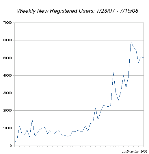 Justin.tv has seen explosive growth since March, gaining 650,000 new users and the equivalent of 62 more years of video to be exact. Below is a chart that represents their growth in weekly new registered users for the past year.