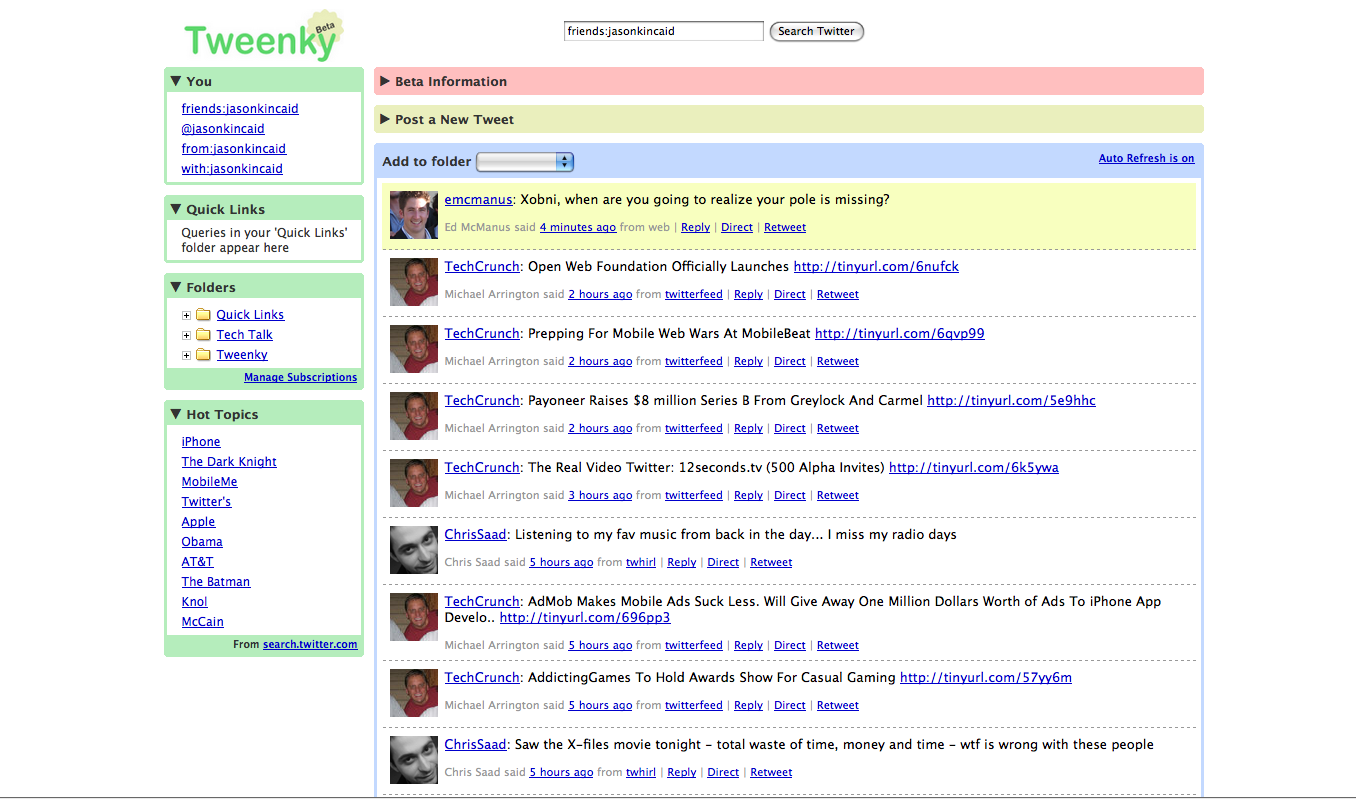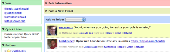 Users send new tweets from a form at the top of the page that includes integration with link-shortening sites snipurl.com and is.gd. The familiar left sidebar is broken into shortcuts, folders, and a list of hot topics taken from search.twitter.com (formerly Summize). Each folder represents a collapsible lists of keywords and Twitter users that you’ve subscribed to. The site also emulates Twitter’s Track function, which lets you keep tabs on a certain keyword over IM or SMS (Twitter used to have this feature, but disabled it earlier this year).