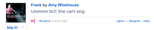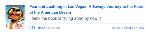 Paring a review down to 160 characters and a rating really forces reviewers to get to the essential appeal or flaw of the work being reviewed. For instance, do you really need to know anything more about Fear And Loathing in Las Vegas than that one reviewer likes it so much, he says: “I think the book is falling apart by now ;)”? Or about Amy Winehouse: “Ummmm NO! She can’t sing.”