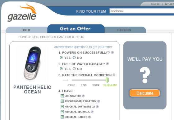I doubt you guys have quite the amount of gadget clutter as those of use who accrue them for a living, but if you’ve even got half our volume of old cameras, phones, and devices in general laying around you may find Gazelle’s service helpful. Not everyone has a used computer recycler like RePC in the Northwest. And while GameStop might buy your DS and there’s always Craigslist, it might be nice to have a central location with competitive (and market-generated) pricing for your old gear. It’ll recycle stuff for you as well if it has no market value.They wouldn’t buy my Trace, and they offered me $74 for my Ocean, which is probably market value although I bet I could get $100 if I tried real hard elsewhere. Selling an old MacBook looked pretty easy, though selling a Thinkpad was kind of a mess of model numbers which would be trouble for a clueless user who found it in their basement. Give it a shot and see if it’s something you’d use.