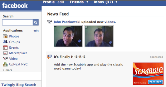 Last week, Hasbro filed suit against the owners of Scrabulous, Rajat Agarwalla and Jayant Agarwalla. The same day, EA publicly launched its officially-sanctioned Scrabble game on Facebook. (See screen shot below, which I took that day).