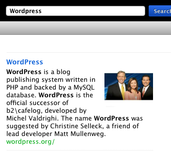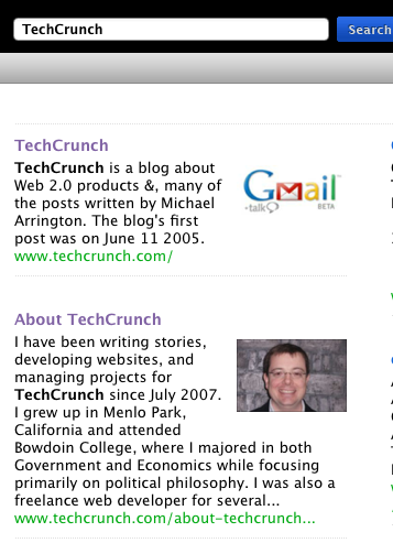 And when Cuil tries to pair images with sets of search results, it often chooses seemingly random images to accompany a set of results. For instance, “WordPress” is associated with what looks like a TV newscast team and “TechCrunch” is paired with a Gmail logo. And I have no idea who that person is next to the results for our “About” section.