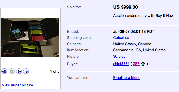 Someone probably should have mentioned that to the winner of this Sidekick 2008 auction. Just a day before the new Sidekick was readily available at T-Mobile spots around the nation for $149, the unlucky bidder dropped a hefty $999 down for the handset and four $15 dollar face plates in a limited edition cardboard box.