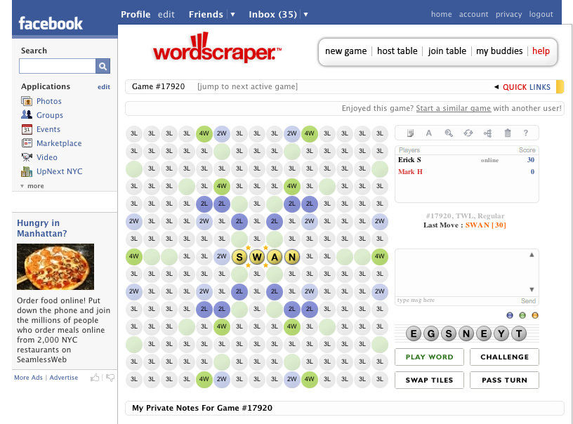 When Scrabulous was taken down, it had half a million daily active users and Hasbro’s/Electronic Arts’ official Facebook Scrabble game had only about 15,000. Two days later, the official Scrabble beta is up to 63,000 daily active users. Wordscraper has 3,600 daily active users. Now the race is on. Where will the bulk of Scrabulous fans go?
