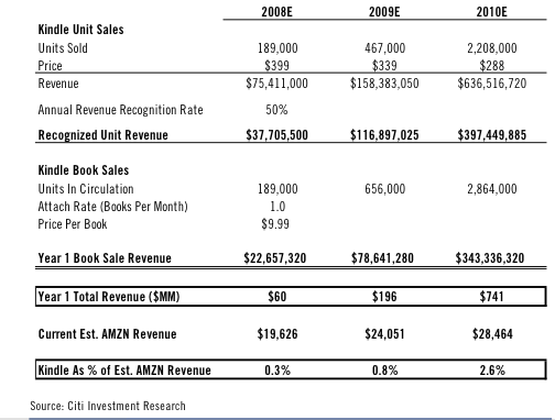 Back in May, Citi analyst Mark Mahaney was estimating that total sales of Kindle’s this year would only reach 189,000. That number may have already been surpassed (depending on how many of the 240,000 units Amazon sold before January). His estimate called for 467,000 units to be shipped next year, and 2.2 million in 2010, resulting in total revenues going from $60 million in 2008 to $741 million in 2010. It might be time for him to revise those numbers upward. (Below is his model from May):