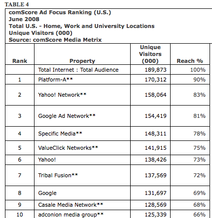If Time Warner can convince Yahoo it still needs AOL, it might get closer to that $10 billion valuation for the online ad and content business. (Except that transaction would likely be structured so that Time Warner gives Yahoo cash in return for a large minority stake in the new combined AOL-Yahoo). According to comScore, AOL’s Platform-A is the largest online advertising network in the U.S. in terms of its reach, with 170 million individuals seeing its ads in June. Although Yahoo is probably bigger if you add together the reach of its advertising network with that of its own sites, depending on how much overlap there is. And many of those Platform-A ads, especially those from Advertising.com, are remnant ads sold at less than $1 CPMs (so volume is key).