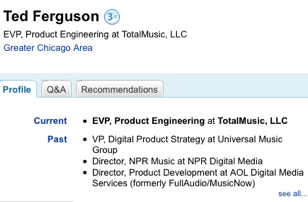Indeed, TotalMusic lives on, although in a different form. A search on LinkedIn for “TotalMusic” returns four people who list it as their current employer (Ted Ferguson, Troy Denkinger, Robert Broome, and Derek Reeve). All four live in Chicago and all four previously worked at MusicNow, another music service that changed hands between Circuit City, AOL, and ultimately the new Napster (not a good omen). A couple job listings, like this one posted on July 15 for a senior software engineer, describes TotalMusic as being based in Herndon, VA (near AOL old headquarters):