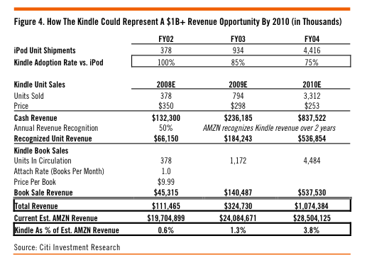 This morning, he took me up on that suggestion, doubling his Kindle sales estimates to 378,000 for this year, 934,000 next year, and 4.4 million in 2010. At that point it would be a $1 billion business for Amazon. (See his model below).