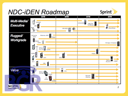 The main morsel in the slides is the BlackBerry 9350i, a Nextel Direct Connect ready BlackBerry with Curve like aesthetics. In addition to its iDEN friendliness, it’s got WiFi, GPS, running OS 4.6 right off the bat. According to the road map, it should show up sometime in Q4 of 08.
