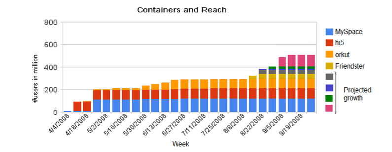 Six months ago, OpenSocial was nothing but a list of promised partnerships. But the social network application platform backed by Google has made a lot of progress since then as those partners started to go live with their OpenSocial Apps. First there was MySpace and Orkut, then Hi5, and most recently Friendster. All told, if you add up the various social networks that are now live with OpenSocial, it reaches a total of 350 million users. And it will soon reach 500 million, as four more social networks and services prepare to launch by the end of of September (see chart above).