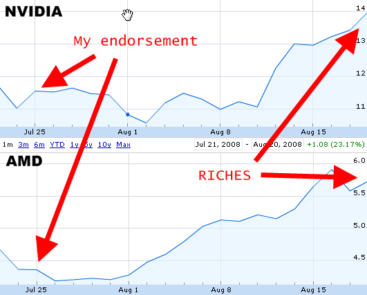 Oh ye of little faith! Last month I posted about how I thought AMD and NVIDIA stocks were undervalued but the companies themselves were thriving. Buy, buy, buy, I said — to general disapproval. It’s not customary of course to give stock tips on CrunchGear, and to be honest I wouldn’t trust myself to invest a roll of quarters, but it looks like my amateur day-trading instincts were on the money this time.