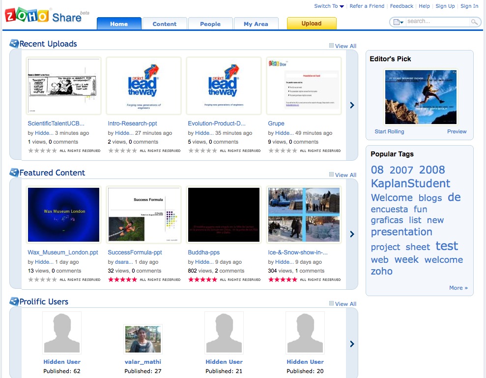 Zoho is pulling together its three main Webtop productivity products (Zoho Write, Zoho Sheet, Zoho Show) into a central destination: Zoho Share. Just as Microsoft bundles its corresponding desktop products into its Office suite, bundling makes sense on the Web as well. Zoho already does this with Zoho Apps, as does Google which has long bundled its Web-based word processor, spreadsheet, and presentation apps into Google Docs. With Zoho Share, Zoho does take things a step forward, though, by adding social elements and a friendlier user interface.
