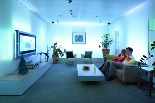 The HomeLab at the Philips research center is a model home built to test and monitor real-world response to prototype technology. Thirty cameras and microphones record subjects as they use and interact with products for the home; then researches review the recordings to refine the products. The living room is currently configured to demonstrate ambX (pronounced “ambiex”), the successor to AmbiLight, which extends the accent lighting from around the television to throughout the room.