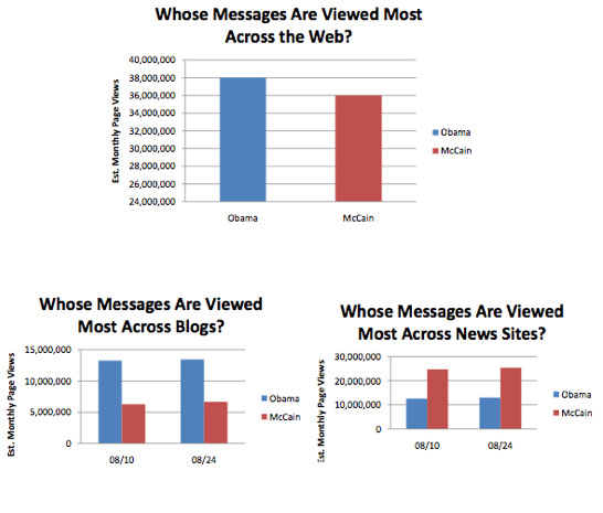 Attributor captured the candidates’ official speeches and position statements from the campaign sites, www.johnmccain.com and www.barackobama.com, and then scoured more than 25 billion pages on the Web to see where those words reappeared. In general, Obama’s message continues to resonate more overall, but just barely. Attributor estimates that Obama’s message was picked up on Websites that drew 38 million pageviews over the past two weeks, compared to 36 million pageviews for Websites that picked up McCain’s message. This represents a 10 percent surge by McCain.