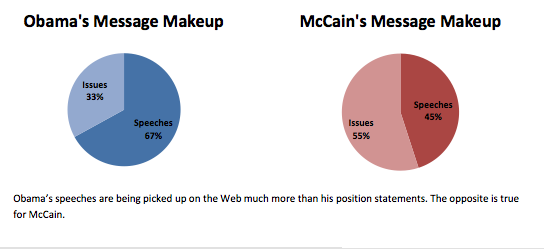 A deeper dive into the data confirms another obvious conclusion: Obama has better speech writers than McCain. Two thirds of the Obama citations across the Web come from his speeches as opposed to his issue papers and position statements. For McCain, 55 percent of his messaging being picked up elsewhere comes from his position statements.