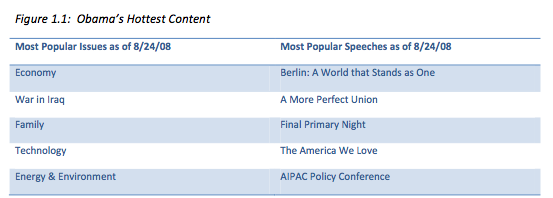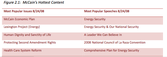 The single topic for each candidate that resonated the most across the Web over the past two weeks was the economy, which for Obama overtook Iraq as a hot-button issue for the first time. The most popular speeches for each candidate was McCain’s Energy Security speech, and Obama’s Berlin speech (which has gone viral and has been viewed more than an estimated two million times).